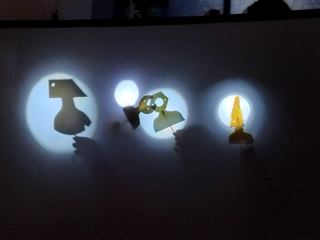 Tirée de l’album jeunesse « Et Puis » créé par le duo d’artistes Icinori, l’histoire racontée dans cette pièce parle de nature et d’écologie. Les personnages principaux sont des hommes-outils, et c’est notamment avec leur silhouette que les enfants ont pu expérimenter les jeux de lumières.