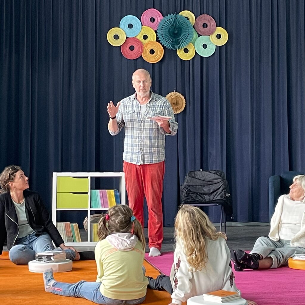 Pour cette première, c’était le comédien Erwan David, de la compagnie du Grand Tout, qui a co-animé l’atelier avec Dominique (médiatrice chez Très Tôt Théâtre).