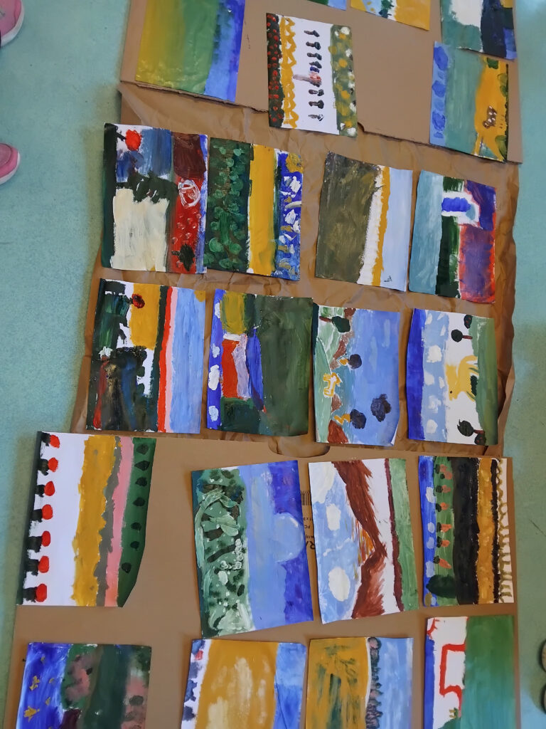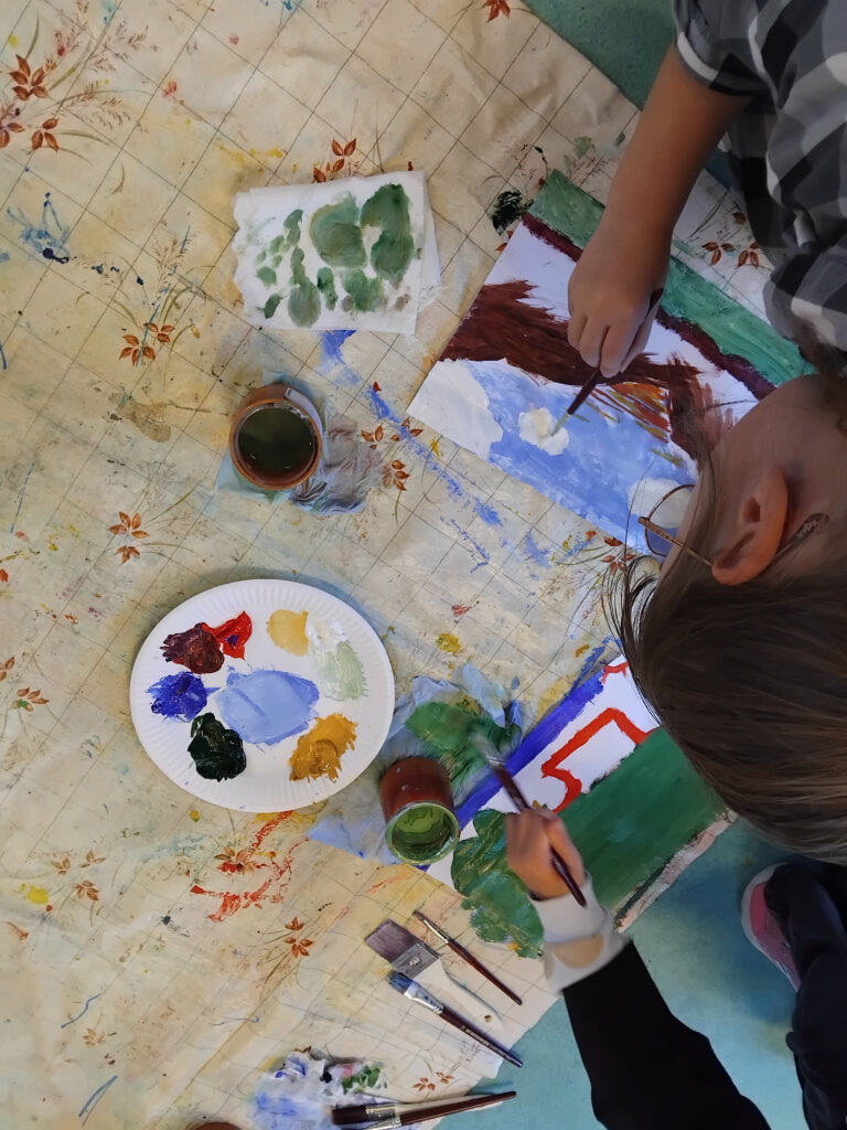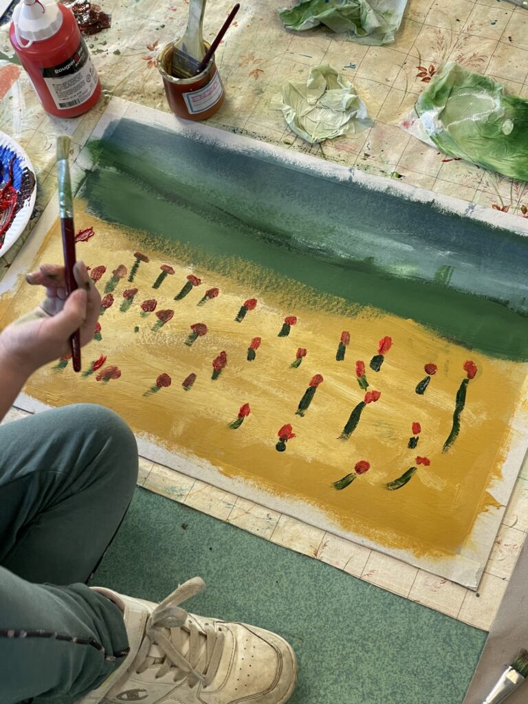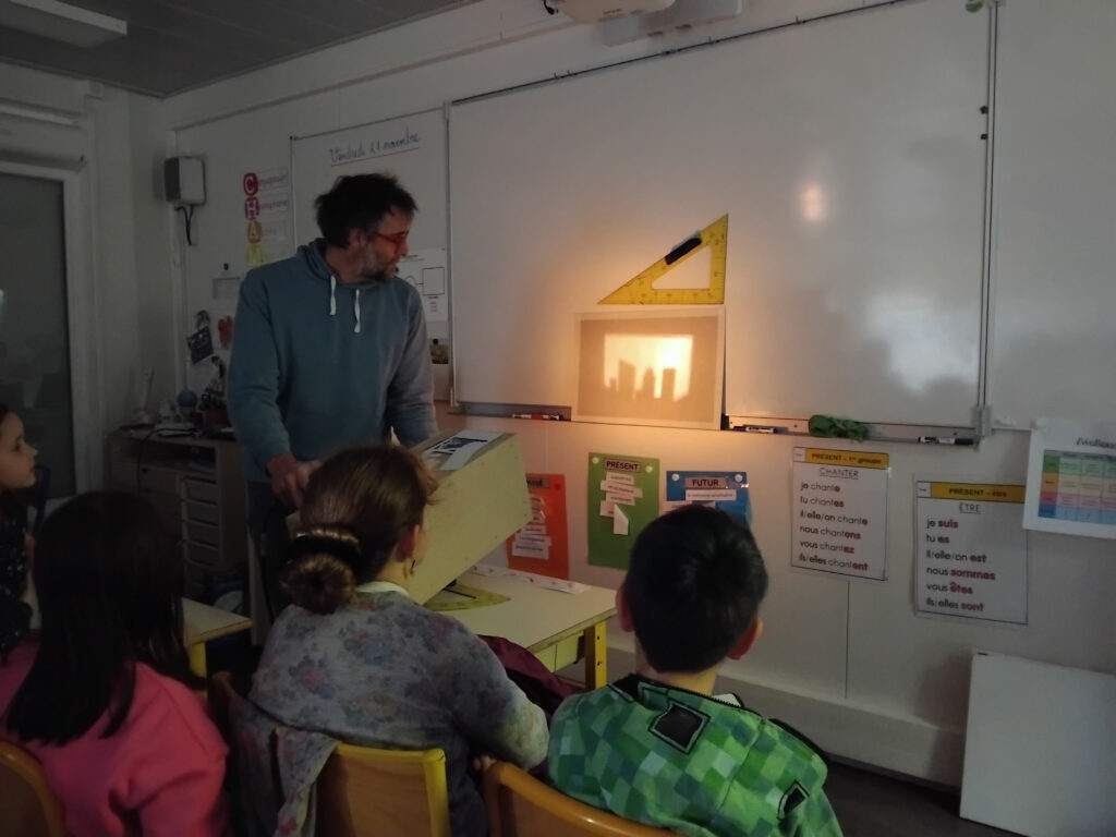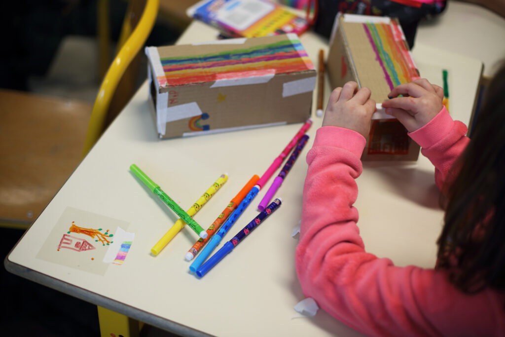 Les ateliers peinture et construction menés auprès des enfants inspirent les artistes dans leur travail sur la scénographie du spectacle. Ensemble, enfants et artistes, expérimentent, se trompent et recommencent. Les enfants de la classe complice sont donc de précieux collaborateurs artistiques !